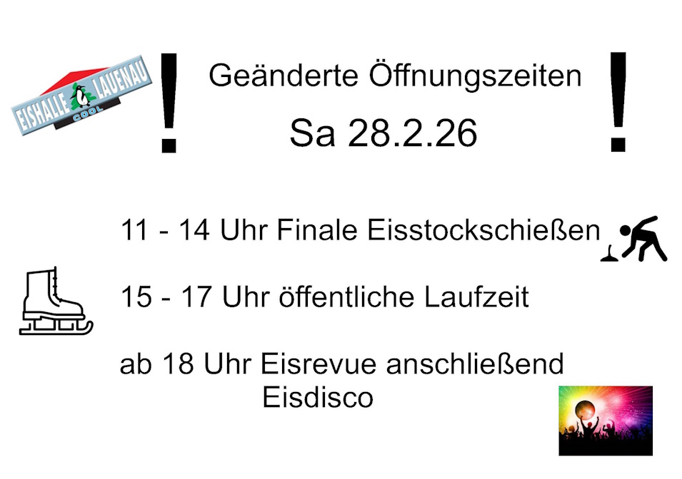| Eisstockschießen Di., Do., Fr. wenn keine andere Veranstaltung. | 18:30 - 20:30 Uhr | Schlittschuh Verleih | 3.- € |